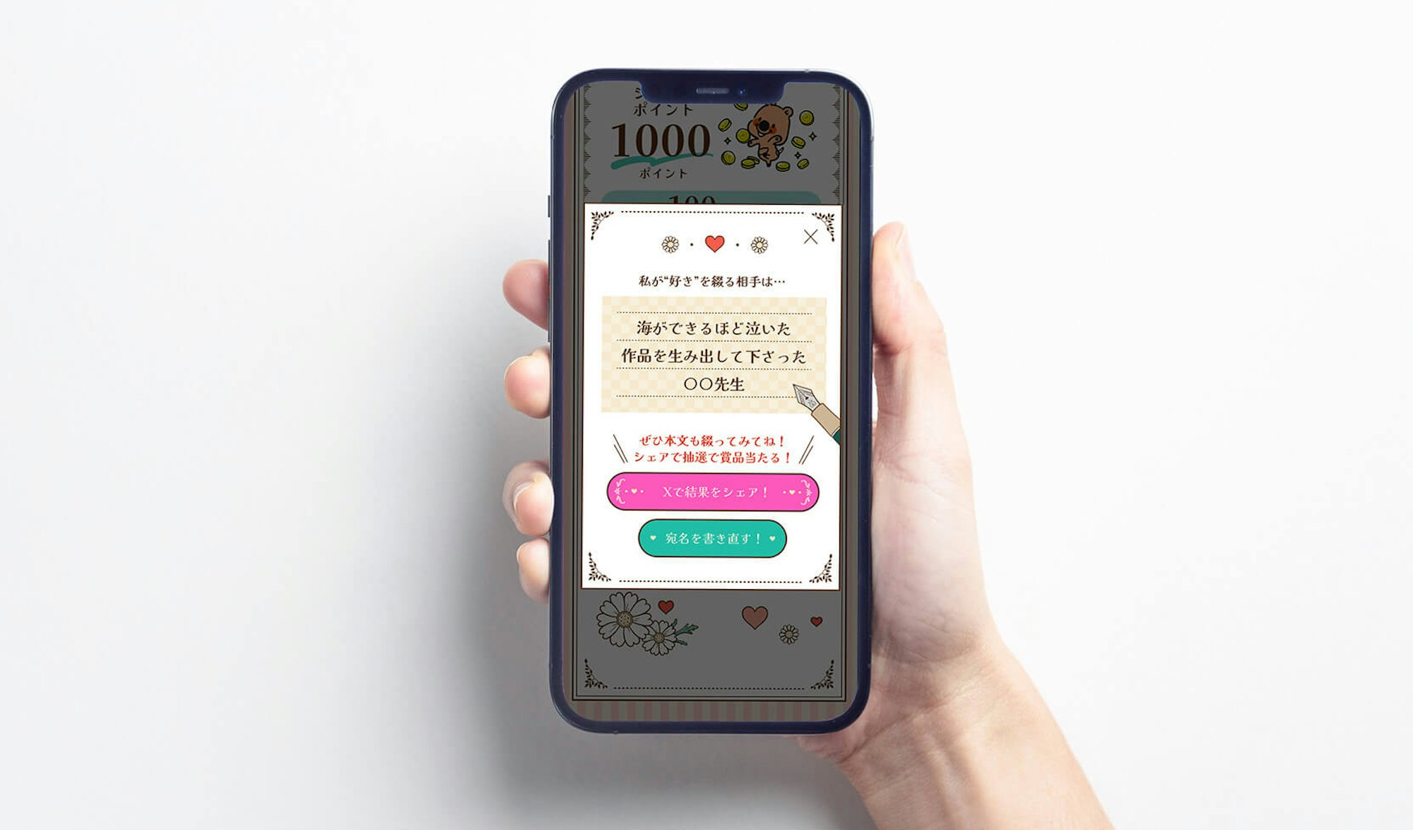 6月12日の「恋人の日」に合わせて開催された、愛を伝えるフォロー&リポストキャンペーンのLPデザイン・コーディングを担当しました。 BLファンが思わず参加したくなるような、親しみと遊び心のあるビジュアルを意識。ガチャ形式を取り入れたキャンペーンの世界観に合わせ、SNS上で自然に拡散される軽やかさをデザインでも表現しました。 また、ダブルチャンス企画にあわせた特設サイト用のビジュアルも展開。推しカップルや好きな作品など、“愛を伝える”楽しさを視覚的に感じてもらえるよう、画面全体のトーンやリズムを丁寧に設計しています。